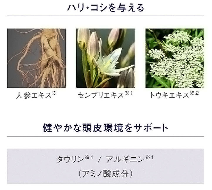 人参エキス※、センブリエキス※1、トウキエキス※2など、複数の植物エキスに加え、タウリン※1、アルギニン※1などの頭皮環境をサポートするアミノ酸成分を配合。さらにカキタンニン※1も配合しました。頭皮をやさしく洗い爽快感のある香りで、頭皮のニオイもすっきりケアします。