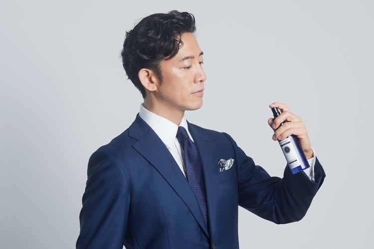 出勤前や商談前、食事やタバコの後にスーツから20~30cmほど離し、ニオイの気になる箇所にシュッとスプレーしてください。シワを取る時は、同じ箇所に1~2回スプレー後、両手で生地を伸ばします。シワやニオイが気になる時は、多めにスプレーしてください。充分に乾かしてから着用ください。